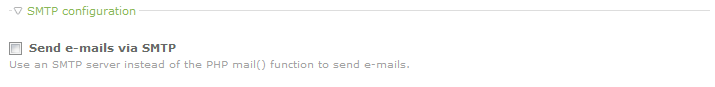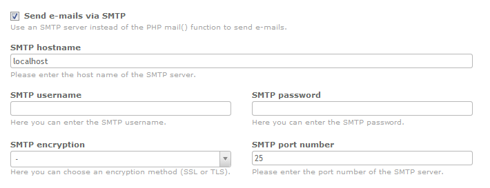 Scroll down the Settings section until you find the SMTP configuration section. By default, the option for Send e-mails via SMTP is not checked. Click on the check-box and you will see the SMTP options appear.
