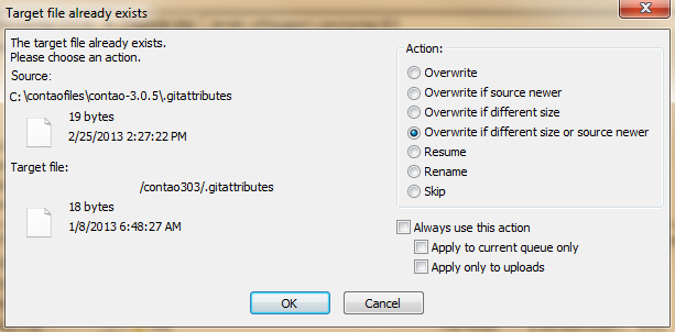 FileZilla will note when you have differences in file version and show a dialog screen saying Target file already exists. You will see the screenshot at right. As per the screenshot, select OVERWRITE IF DIFFERENT SIZE OR SOURCE NEWER, then click on OK in order to proceed.Note: The duplicate files exist because you are manually copying the files over from the newer version to the older.