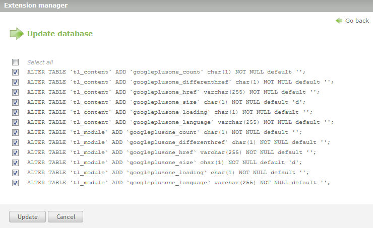 The next screen lists all of the database updates for the Google Plus installation. Click on UPDATE in order to proceed.