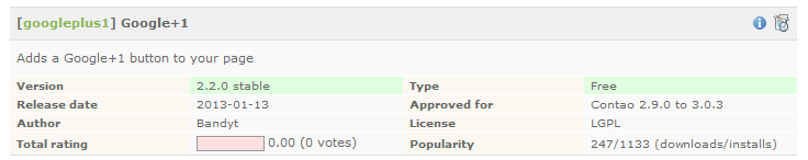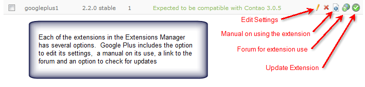 This completes the installation of Google+ onto the Contao website. The next part will be to actually implement the button on the website pages. When the installation is complete you will see the Google+ option in the Extension Manager (as per the screenshot at right). The documentation in the online manual indicates an interface in the Settings section, but this appears to have been removed. Please see Adding the Google+ button to Contao Pages for the next step in setting up Google Plus for Contao.