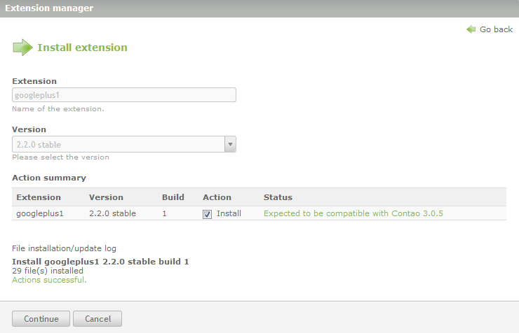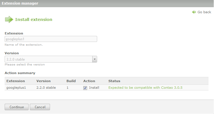 Check the status in the next screen in order to see if the extension is going to be okay with the version of Contao that you are using. See the screen at right for an example. Click on CONTINUE in order to proceed with the installation.