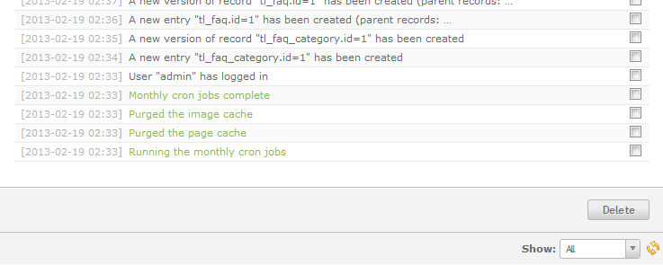The System Log is used by the Contao application to record a list of text entries of actions taken in the Contao Administrator back end. The purpose of the list is to provide a history of events that occurred in the use of the application. Each entry has a time and date entry and the text describes the action and the specific item affected by that action. Error messages are marked in red and each entry includes a checkbox for selection purposes. The following article shows how to find, read and delete the System log within the Contao Back end.