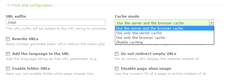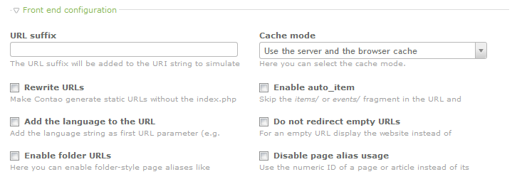 | Rewrite URLs | Enable this option to generate static URLs without the index.php; requires mod_rewrite and using the Contao provided htaccess file. |