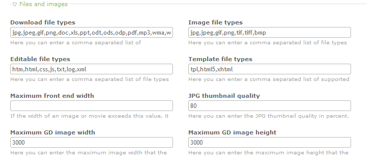 Contao centralizes the file types and image settings within its System>Settings area. These eight settings deal with downloadable/editable file types, image file/template file types, maximum dimensions for images in front end, and the quality of the JPEG thumbnails. The following article walks you through finding these settings and making changes with them.