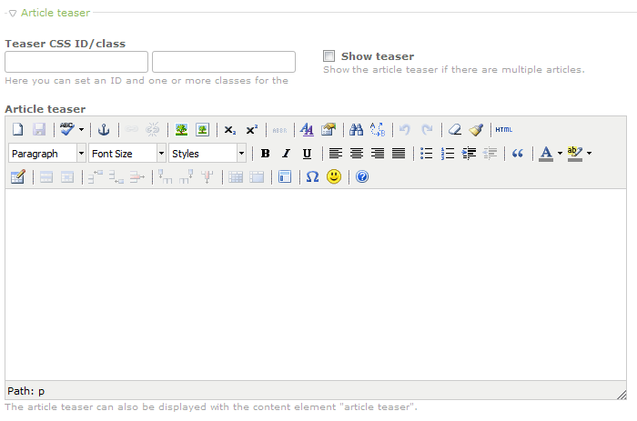 TEASER CSS ID/class - allows you to add a CSS ID or CSS class for the teaser element. The SHOW TEASER option works when there are multiple articles. You can show snippets of the articles based on what you create in the teaser. The editor screen for the Article Teaser appears below these options and allows you to enter the text and graphics that you want to show in the teaser. Click on the blank field to add the CSS ID or CSS class, then click on the check box to show the teaser (if you have more than one article). Create the teaser in editor provided.