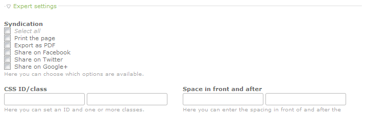 The EXPERT SETTINGS section starts off with a group of checkboxes called Syndication. The syndication section allows you give the option for people who read the article to print the page, export as PDF, share on Facebook, share on Twitter, share on Google+, or all of the above. The next option then allows you to set a CSS ID/class for the article. This is similar to the teaser option, but this ID is specifically for the article. The last option in this section allows you to add a space before and after the article based on numbers of pixels. For example, if you place 100 in the first and second fields of this section, then there will be a 100 pixel space before and after the article. Though Contao provides this option, they also suggest that you actually make the spacing in a style sheet. Select the Syndication options, add a CSS ID/class for the article, and then add spacing (if needed) in the fields provided.