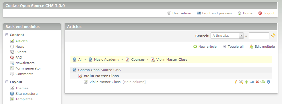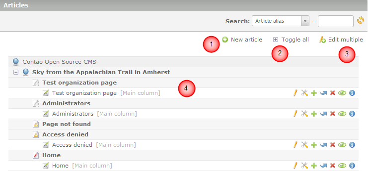 Articles are one of the sections within Contao that allow you to add a page or pages of information that you can share with your users. This page is basically a webpage that you can create and then make accessible to your users. The process of creating the articles involves: