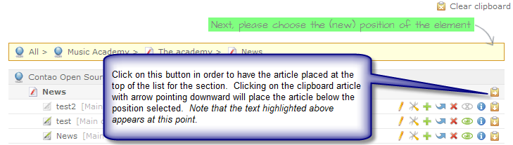 Placement of the article is done by clicking on the clipboard icon at the far right as identified above. It will determine if the article appears at the top of the section, or if the article will appear below the article you have selected. Click on the clipboard to position your article.