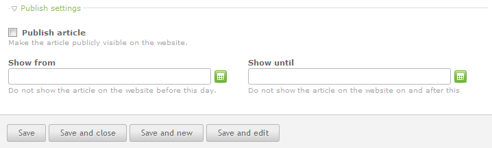 The PUBLISHING SETTINGS allow you to make the article available for viewing in the website. You can set the SHOW FROM and SHOW UNTIL options to display an article for a finite period of time as determined by the fields above. Click on the green icon to the right of each field to easily set a date and time. Click on the checkbox to immediately publish the article, or set a date and time when the article will appear and/or be removed from access.