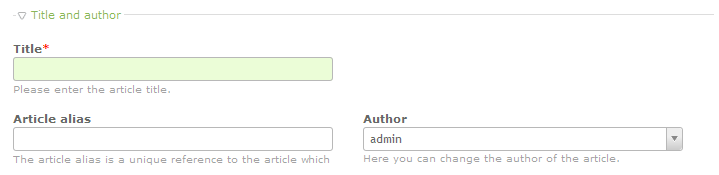 Fill in the title and author section of the new article. Note that the TITLE is mandatory for the article to be saved. You can also click on the drop-down menu to choose the author. The only selectable authors are users within the Contao CMS. For information on Users, please go to Managing Users in the Conto CMS.