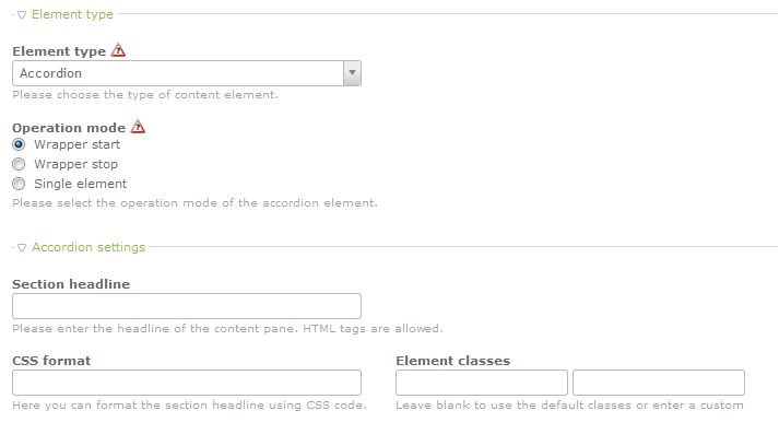 Accordion settings - this section allows you to enter a headline for the content pane. As per the gray description text, you can use HTML tags for the Section Headline. There is also a CSS format field that allows you to format the section headline. Element Classes can also be set using the fields provided. To use the default, leave the fields blank.