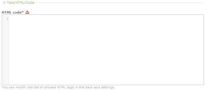 HTML - Allows you to add HTML code for the content through a code editor. Each line is numbered. The HTML Editor interface is shown below: