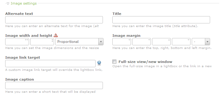 | Image width and height | sets the image dimensions and also the resize method |