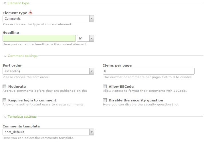 Comments - Allows you to create a comments section for the article. The settings for this section include a headline to label the area, a sort option, the ability to limit the number of comments per page, a requirement for moderation, the option to allow/disallow BBCode, a requirement to login in order to comment, and checkbox to disable the security question. You can also format the comments using an existing template. Here's a screenshot showing how these options appear when the element type is selected: