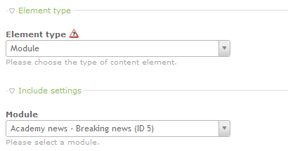 Module - Insert an existing module from Contao installation. The existing modules are available via a drop-down menu as shown in the screenshot below: