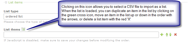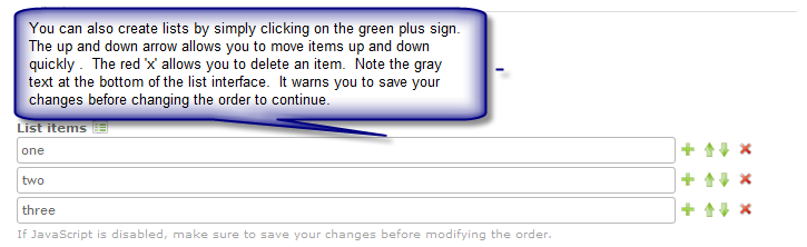 Create Listed items - based on the LIST TYPE defined, manually create a list by clicking on the green plus sign to add another list item. Use the arrows to move the list items up or down. And click on the red 'X' to delete a list item.