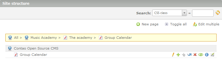 For the purposes of this tutorial, we are going to create a GROUP CALENDAR that can show the Contao Calendar module that comes with this theme. Click on NEW PAGE in the top right hand corner.
