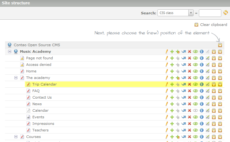 As per the screenshot above, click on the clipboards to position the new page. The highlighted page indicates where the page would appear if you were to click on the clipboard (with the arrow pointing to the right) for "The academy". If you are dissatisfied with the position of the new page, you can click on the blue arrow icon and then move the page to a different location as necessary. For the purpose of this tutorial go ahead and position the page so that it is in "The academy" group as per above.