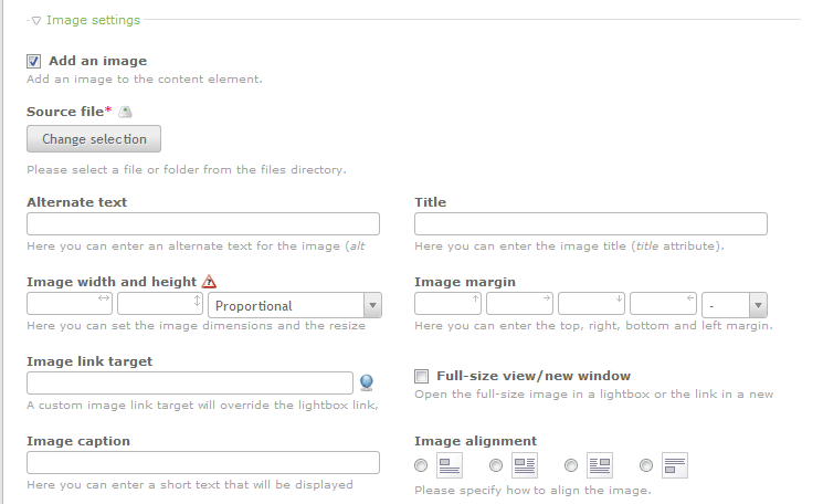 When your file has been uploaded, you will see it positioned in the location that you selected. This completes the instructions to uploading the files, but some files may need one more thing - meta information for the file that you have added to the Contao site. Click on the icon of the pencil (edit icon - the first icon in the group) to the right of the file in order enter the Meta info. This information includes the name, title, link and caption for the file. You can also add meta information based on language. Files that have been uploaded to Contao through the File Manager will be immediately available when adding them into articles. As an example, the screenshot below shows you where you can add images that you may have uploaded through the File Manager Uploader.