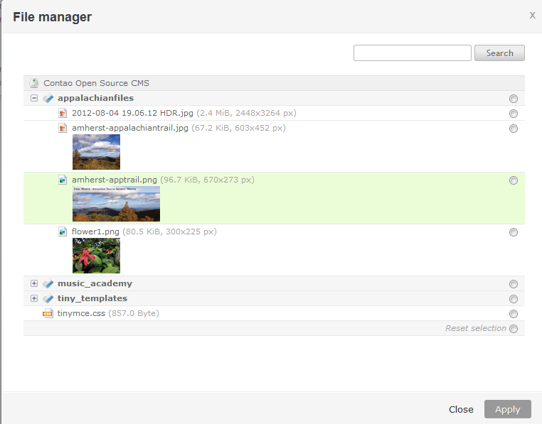 Clicking on the CHANGE SELECTION button lets you select the image files that were added during the File Manager upload. As per the dialog window below: