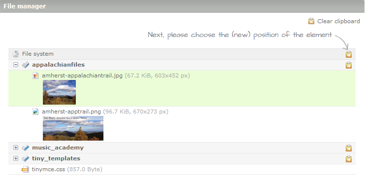 At the top of the File Manager, click on FILE UPLOAD. This will bring you to the positioning dialog. You can determine where your chosen file will be uploaded to your Contao files. Click on a clipboard at right in order to determine where your file will be uploaded. The clipboards match up with the folder divisions being used to organize the files in Contao.