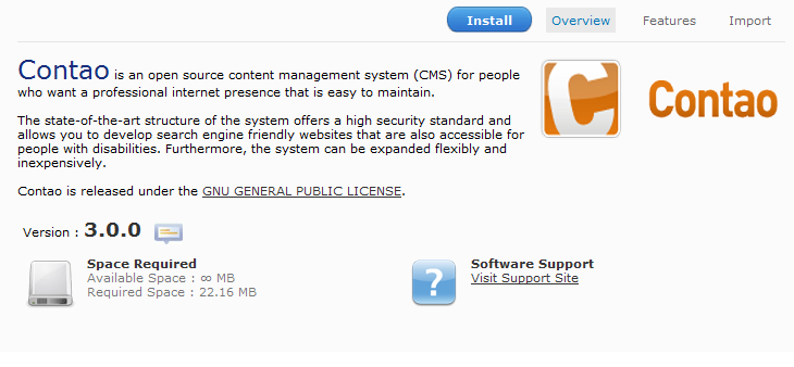 The screen describing Contao will appear as per above. In order to begin the installation process. Click on the blue INSTALL button above the description.