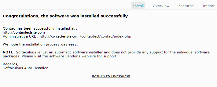 Make sure to make note of the Administrative URL. This is the URL that you will use to login to the Administrator for Contao. If you do not have access to Softaculous, you can find instructions for manually installing Contao here: Manually Installing Contao.
