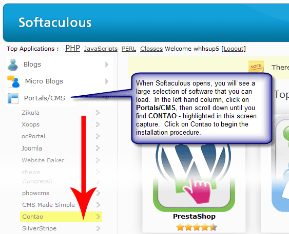 - In the the PORTALS/CMS list and then locate CONTAO and click on it to select it: