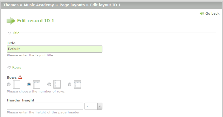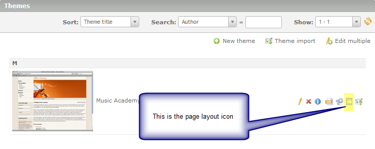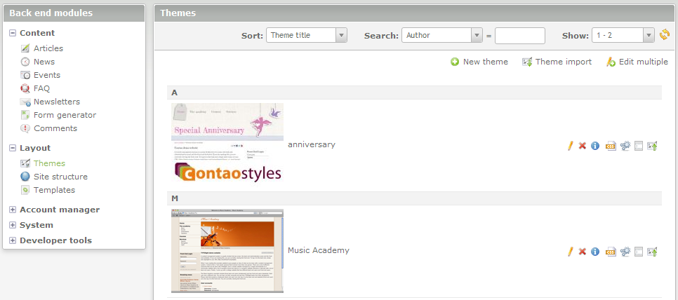 We will begin by modifying the demo site. In the Back End Modules menu (the left hand column menu in the back end), click on THEMES under the Layout section. The screenshot here shows two themes (though you'll only one in the default installation of Contao).