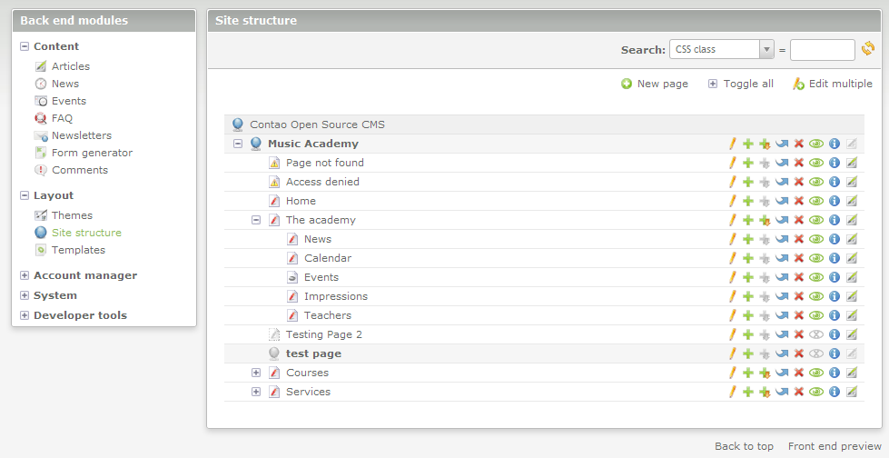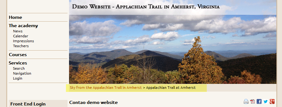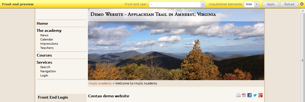 As you can quickly see, the appearance of the front end can be quickly changed to become a more personalized website by simply making changes to the default Contao website. You can see that it is easy to make changes to the appearance and menu structure. If you want to continue using another quick start guide, go to the Quick start to Creating a Page in Contao.