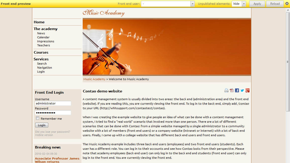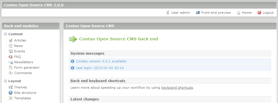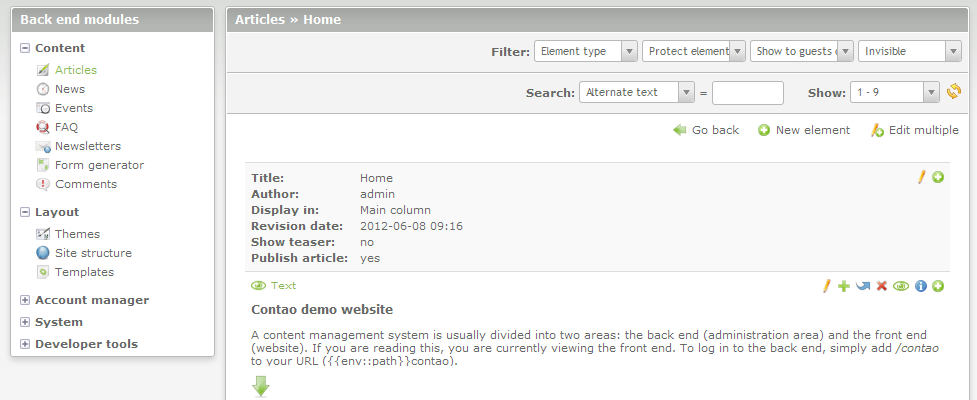 Explaining how Contao works internally to display a website can be fairly complex. We could say that the Contao page consists of a layout (made up of CSS, modules and themes) and the article that contains the content (text, graphics or other media), but this in-depth understanding of the structure can be slow and difficult to understand for the novice. To give you a quick general start on the system, this tutorial will give you only general steps on putting together a website based on modifying the default template with the Contao CMS.