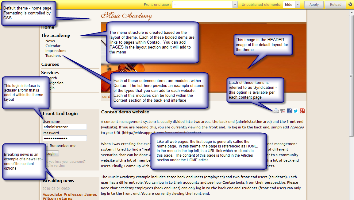 When you install Contao, you will be able to setup a test site that comes with a theme, user data and the other general structures that will be part of a typical Contao website. The template provided with the install can be quickly modified to create a specific website to meet your needs. We will be using the default site in order to familiarize you with using Contao by modifying the header image of the default theme and changing menu structure.