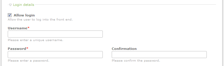 - The Login Details is a simple section containing a checkbox to permit a user to login to the front end or not. It also includes the Username, Password, and password confirmation fields. This section appears like this: