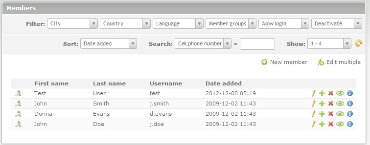 Allows you to filter the results by city, coutnry, language, member groups, allow login fields and deactivate field |
