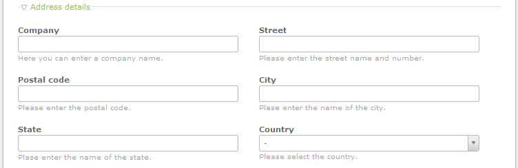 The Address Details section include the Company, Street, postal code, city, state, and country. Fill in each field and then proceed to the next section - Contact Details.