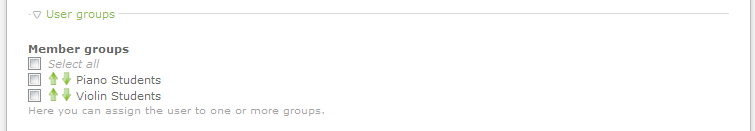 - The User Groups section will include an option to select all of the groups (Select All) at the beginning of the list. Then after that you will see a list of the Member groups that have been collected. Beside each name you will also see an up and down arrow that will move the group in either direction. This is useful for organizing multiple groups so that you can easily see if you have selected all of the groups that you needed. Select a group to assign or move on to the Login Details section.