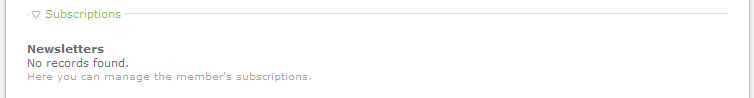 - The Subscriptions section allows you to manage member subscriptions to Newsletters that you may have created within Contao. If you have no newsletters you will see the following: