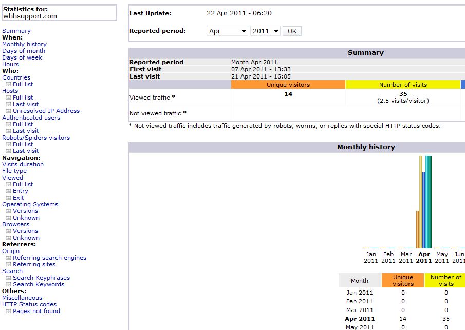 Awstats provides many methods to track and monitor the visitors to your website, what they see, and where they come from. Below is a summary of the many options available in Awstats: