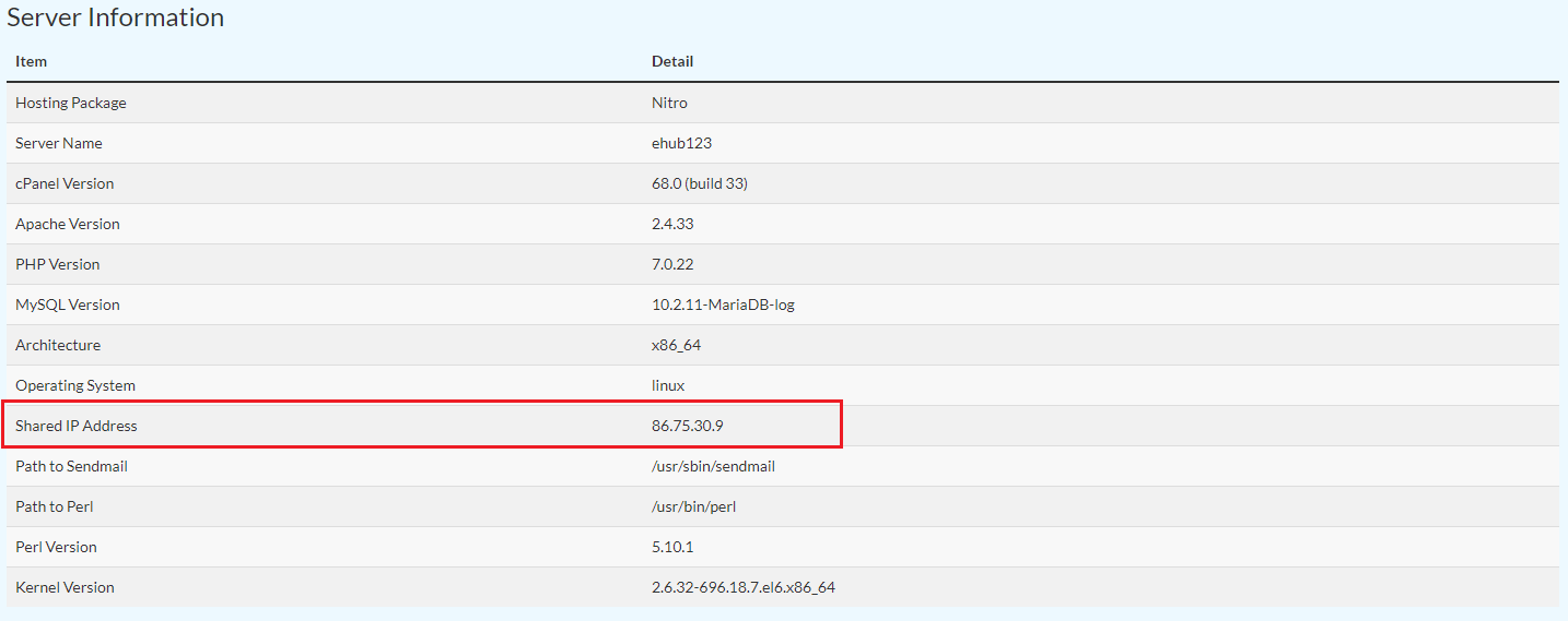 Under the Item column, locate Shared IP Address. The IP address assigned to your account will be displayed to the right, under the Detail column.
