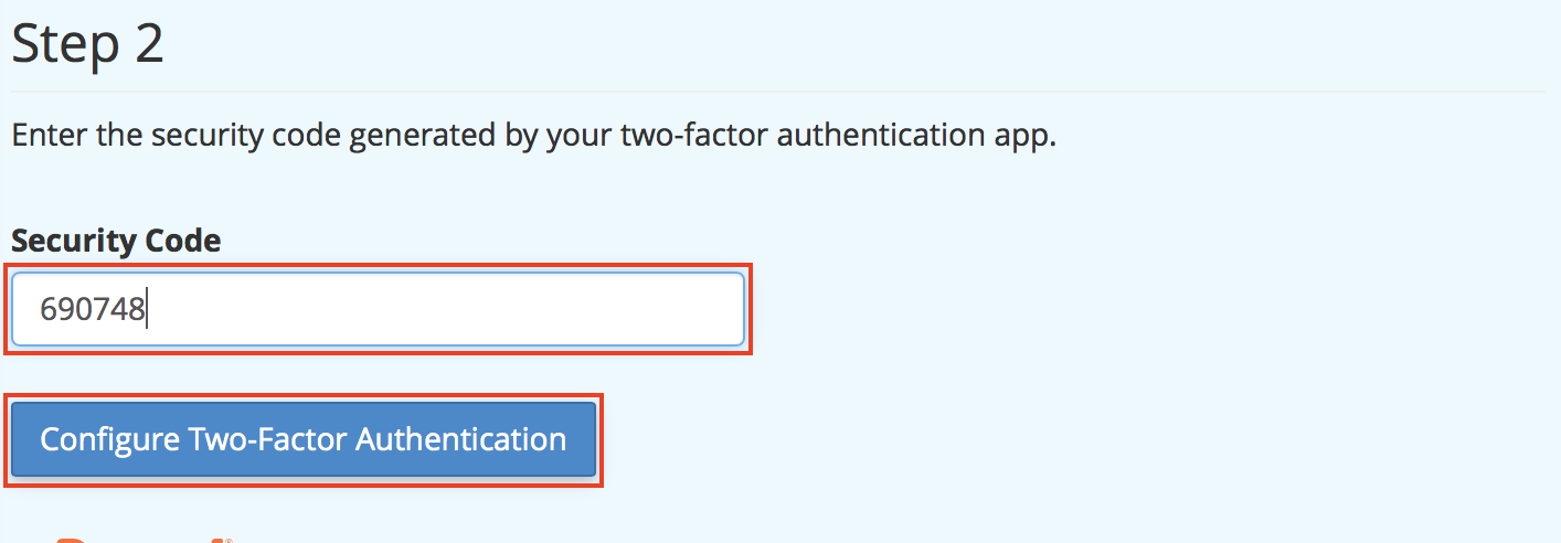 Enter the security code (displayed in your smartphone app) under Step 2 in the box labeled Security Code. Then, click the Configure Two-Factor Authentication button.