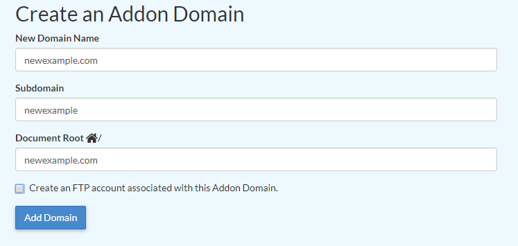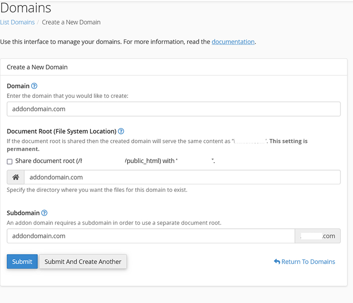 | Document Root: | When adding a new domain to your account, cPanel automatically configures the domain in a folder within your home directory. The default value that is selected should not need to be changed. |