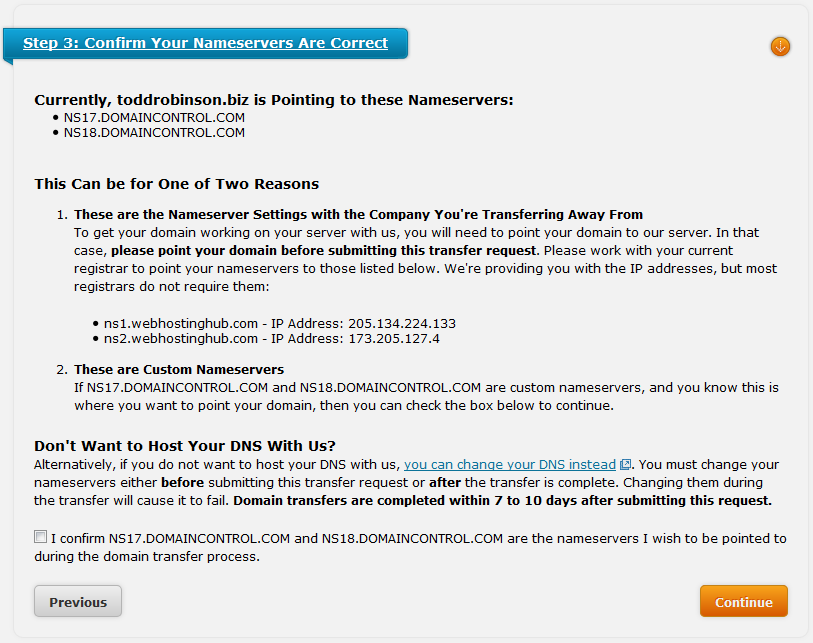 If you seek to move a domain by changing your name servers, or you don't know the difference, please see Transferring my Domain Name to Web Hosting Hub for an explanation.