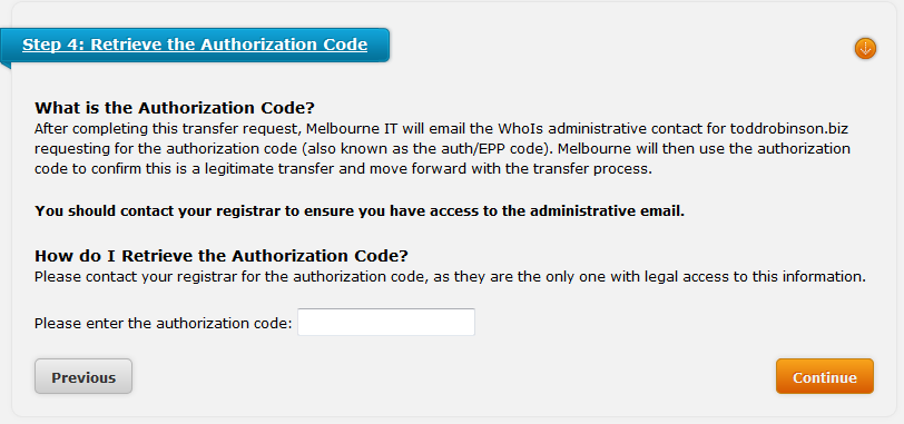 The final step occurs when you receive a reply from Web Hosting Hub's domain registrar - Tucows. You should see a reply within 1-3 days. The email confirming the transfer is sent to the administrator email for the domain. Be sure to check your junk/spam folder. Click on the link in the Email to confirm the transfer. You will then be prompted to enter a "password", but this refers to your authorization code. Enter your authorization code in order to complete the transfer process.