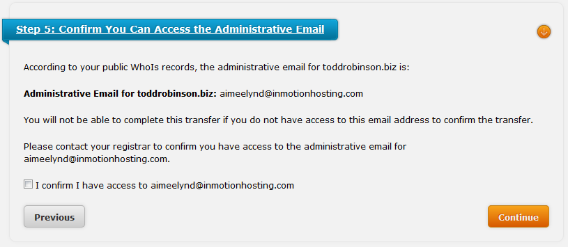 The email confirming a domain transfer is sent to the email address that is designated as the Administrator email on the existing domain. For example: Domain Name: Example.com Admin Name: Data Protected Data Protected Admin Organization: Data Protected Admin Street: 123 Data Protected Admin City: Toronto Admin State/Province: ON Admin Postal Code: M6K 3M1 Admin Country: CA Admin Phone: +1.0000000000 Admin Phone Ext: Admin Fax: +1.0000000000 Admin Fax Ext: Admin Email: Admin-email@example.com The Admin email is a normal part of the registered information for a domain. I chopped out a lot of the registration info above to keep this short. If you don't know what your admin email is, then you need to contact the original domain registrar and determine what it is, or how to update it. I hope that helps to answer your question! If you require further assistance please let us know! |