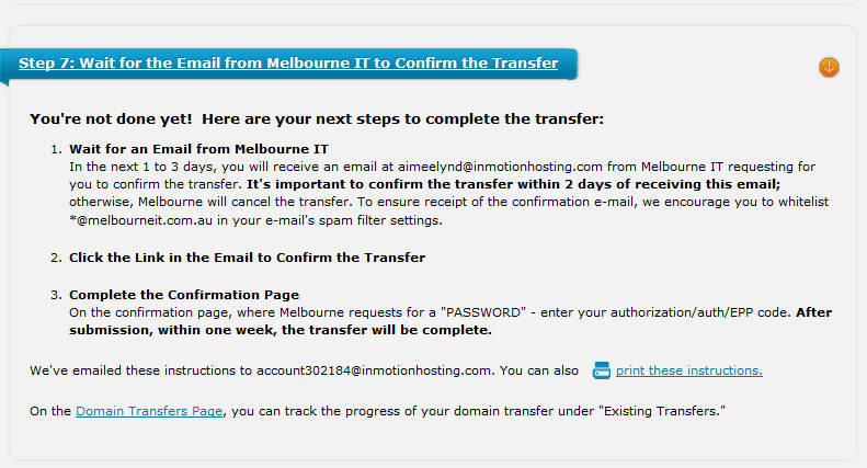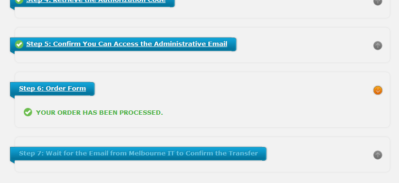 Congratulations! This completes the domain transfer process. Note that although you have completed the transfer process, it may require up to a week before the transfer is finalized between the domain registrars. You will receive an email notification when the domain transer has been completed successfuly.