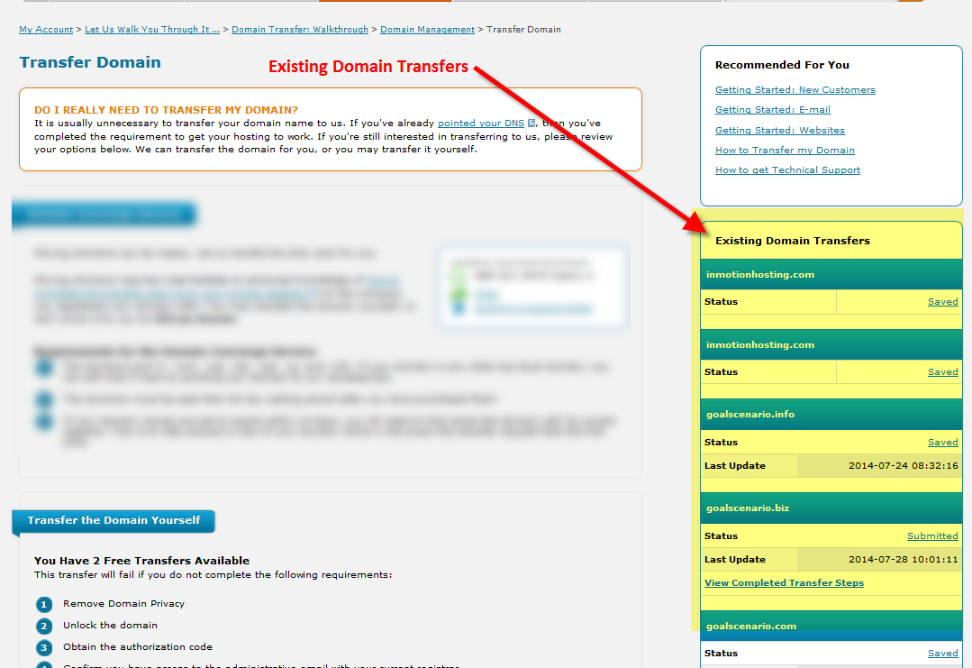 This completes the transfer process using the Domain Transfer Walkthrough. On the same page as the instructions for the domain transfer you will see the List of Existing Domain Transfers in the right hand of the page.