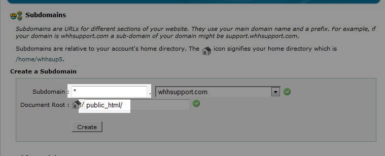 Next, in the "subdomain" field just put a *. A * is often used to signify a wildcard symbol and it does in cPanel as well. Make sure that the Document Root stays as "public_html" as shown below: