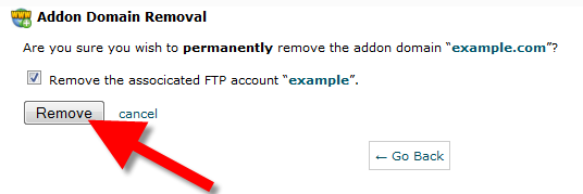 On the Addon Domain Removal screen you will see a message similar to this: "Are you sure you wish to permanently remove the addon domain “example.com”?" and "Remove the associated FTP account “example”." If you do not want to delete the FTP account associated with the domain, un-check the box. Click the Remove button to delete the domain from your cPanel.