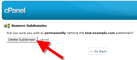 You will then see a question asking "Are you sure you wish to permanently remove the test.example.com subdomain?" Click the Delete Subdomain button to remove the subdomain from your cPanel.
