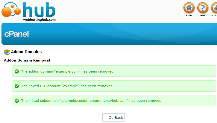 You are finished when you see messages similar to this: "The addon domain “example.com” has been removed." "The linked FTP account “example” has been removed." "The linked subdomain “example.customercommunityhub.com” has been removed."